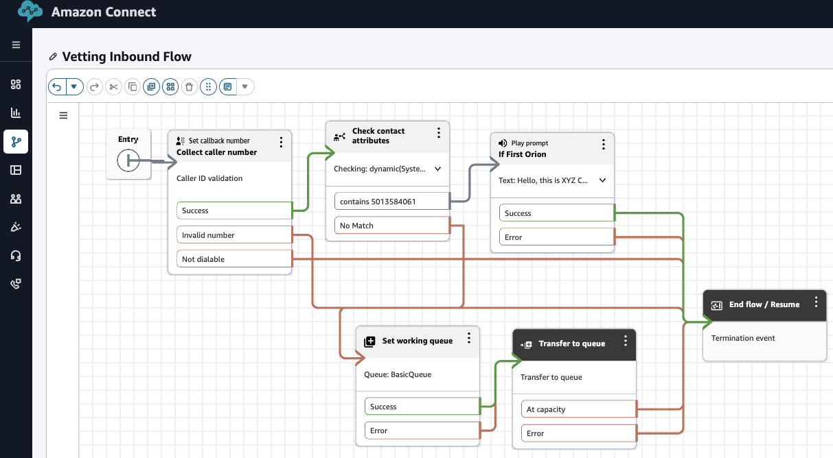 This example uses Amazon Connect as the Client Phone Platform and shows how an inbound flow could work for automated number vetting.