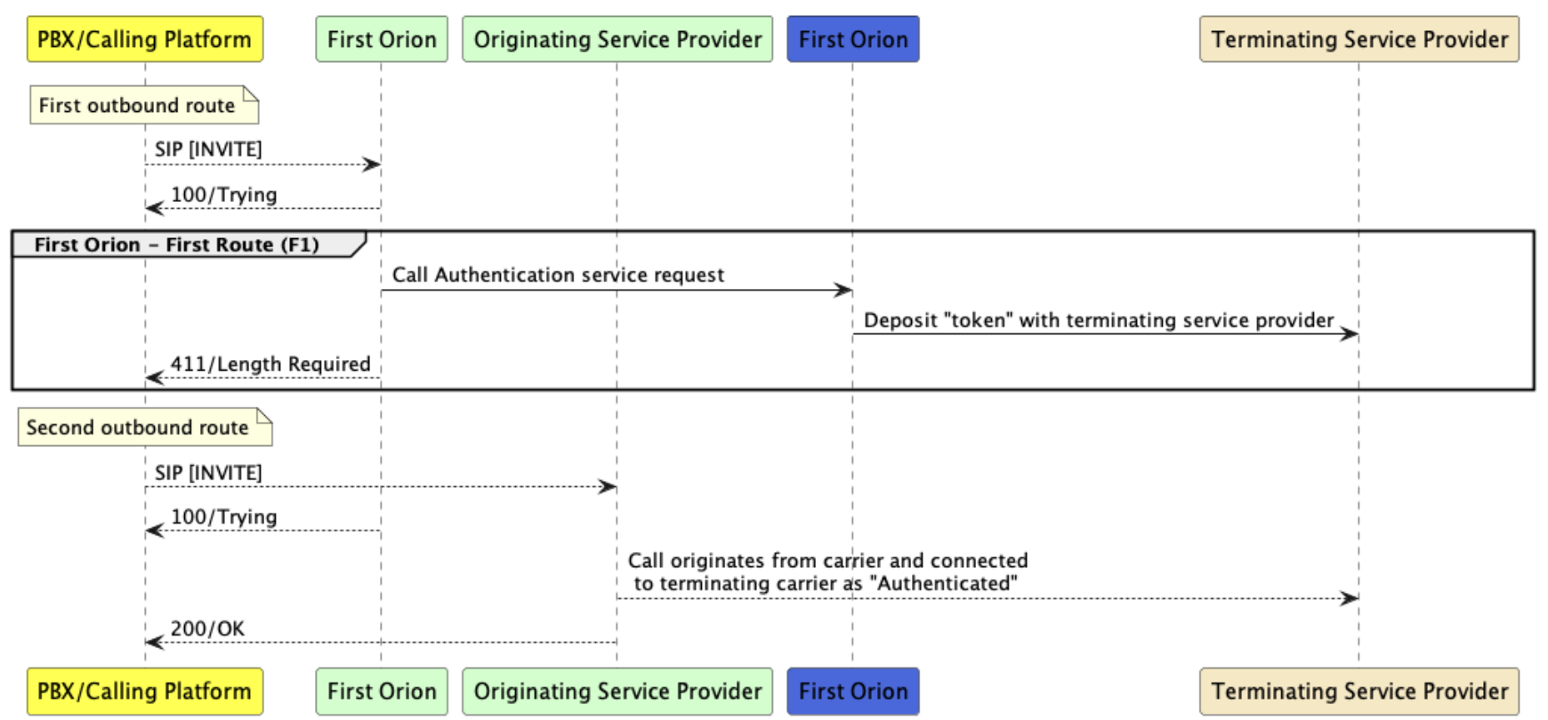 - End-To-End Call Authentication - Prior to the call "originating" enterprises "signal" to First Orion. Branding is then "set" in network for finite amount of time by First Orion. The terminated phone call that passes end-to-end check will be "authenticated" and branded or spoofed accordingly.