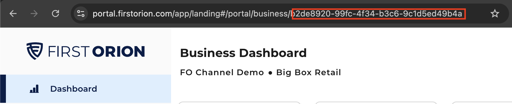 - Find your Business ID in the URL when in the First Orion portal. The ID is located after "business/".